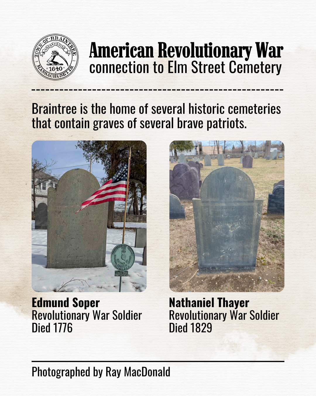 From the Battlefield to Braintree: Tracing Revolutionary War Veterans in Elm Street Cemetery. Check out this Storymap to learn more about Braintree's history with the American Revolution and for a list of more veterans, visit: https://storymaps.arcgis.com/stories/187d5ce36f8d4af5a8cad7f5c74c802d