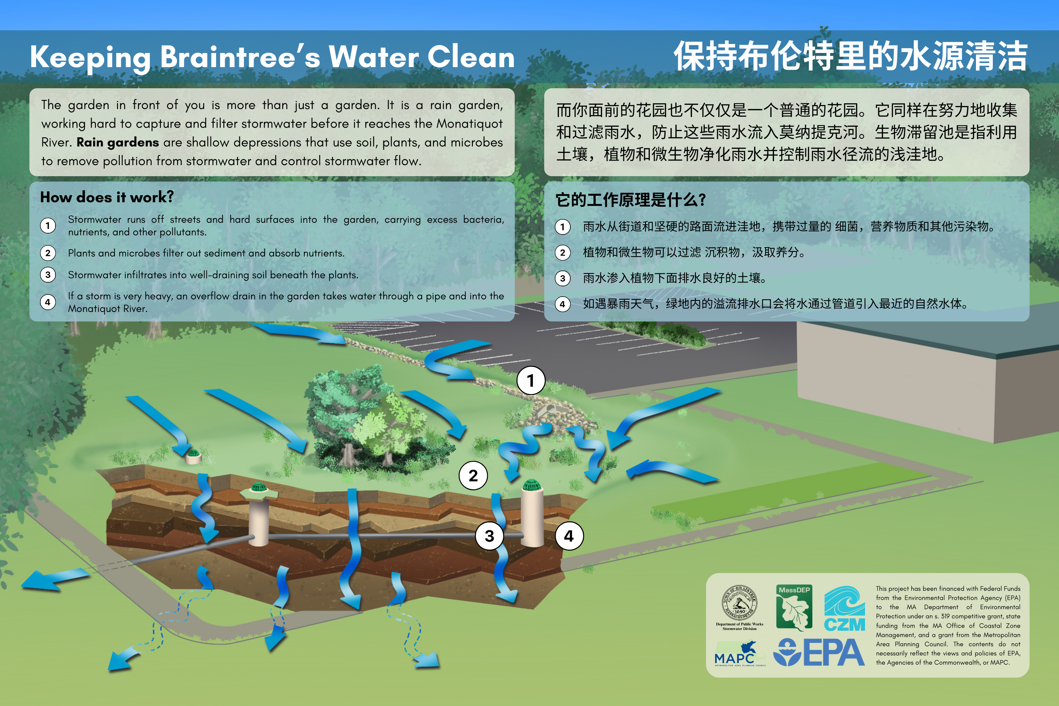 In 2024, we constructed a rain garden, a type of stormwater control measure (SCM). Following the construction of the project at Elder Affairs, we collaborated with an independent artist to visualize the flow of stormwater into the ground. The project's clever mix of art and science won Hillary the Stormy Award, showcasing the Division's commitment to public outreach and education.