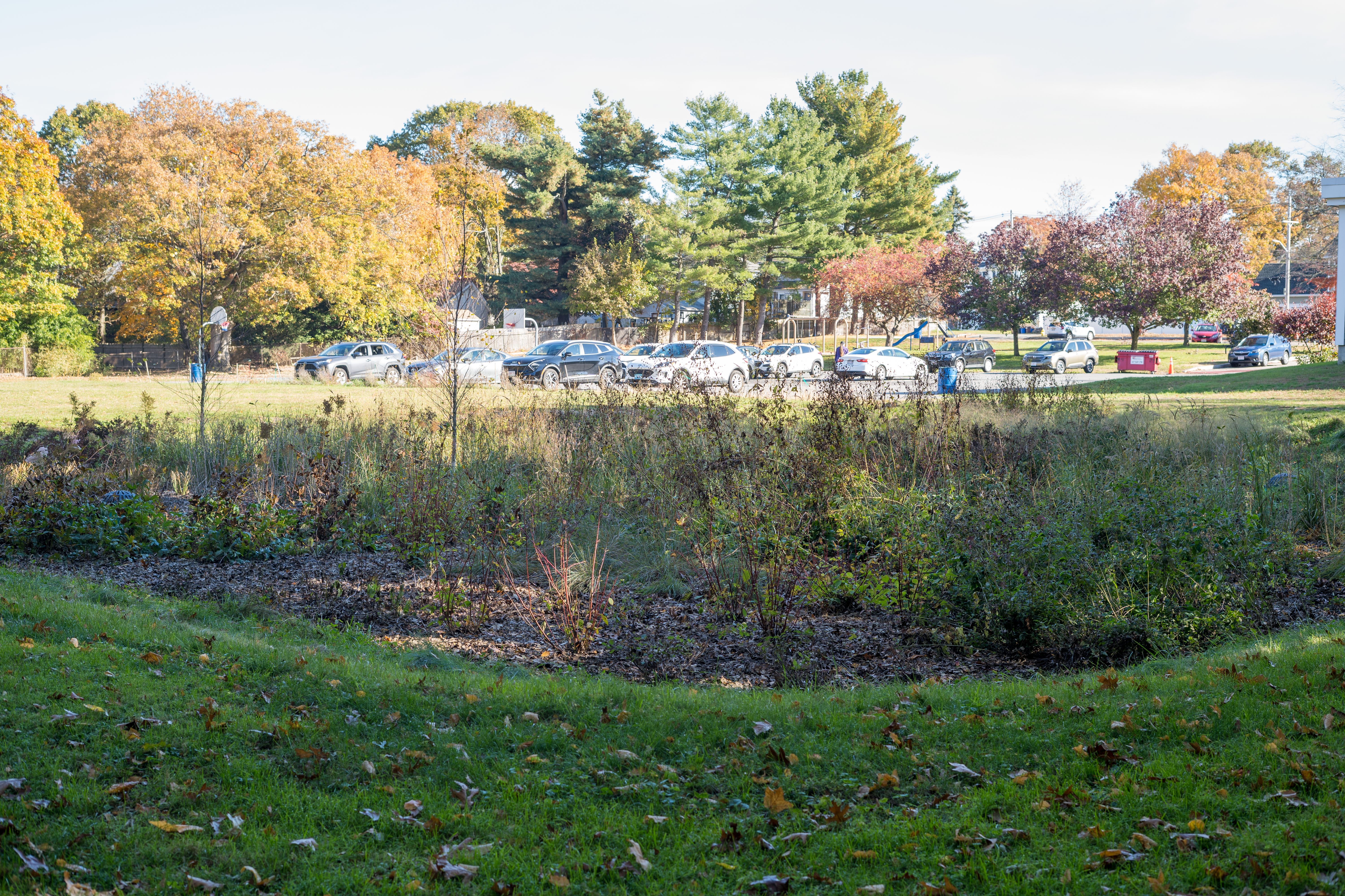 Last year, the area behind Elder Affairs was just a patch of grass. Now, it's a booming rain garden, housing over 25 species of native plants. The basin collects water from the streets above it, cleaning the stormwater as it flows through the rocks and dirt, before safely returning it to the Monatiquot River.