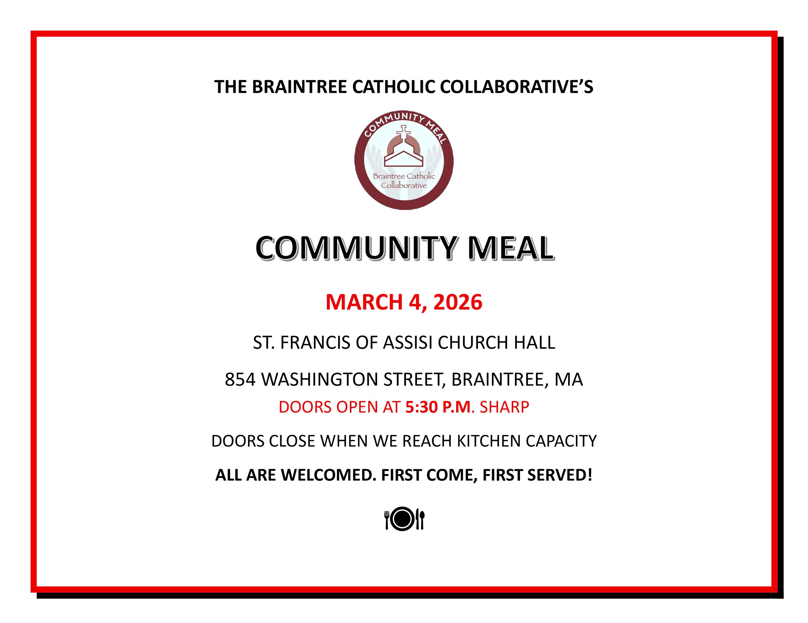 Join Braintree Catholic Collaborative for a free community meal on Wednesday, March 4 at 5:30 PM at St. Francis Assisi Church Hall. They're offering 40 free meals on a first come, first served basis — dedicated to those who truly need them. However, all are welcome. No registration required.